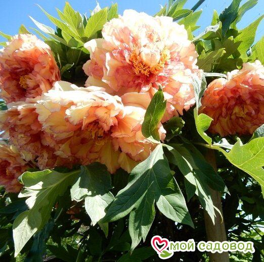 Пион древовидный — морозоустойчивый кустарник, достигающий высоты до 2 м, с крупными ярко-зелеными листьями. На одном кусте может быть от 30 до 70 цветков. Диаметр каждого от 20 до 25 см. Продолжительность цветения 12—14 дней. Растение декоративно и после цветения из-за необычной формы листьев. Пион неприхотлив, устойчив к болезням. На одном месте без пересадки может расти более 20 лет.